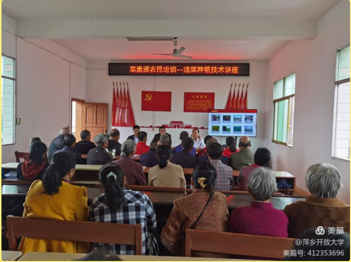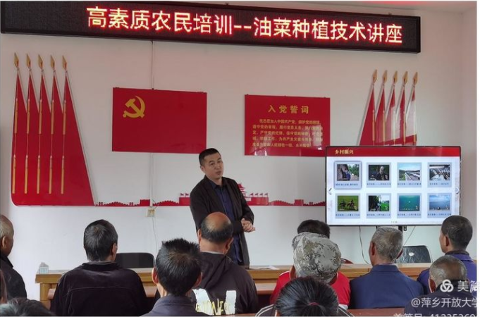 习近平总书记强调人才振兴是乡村振兴的关键,培育新一代高素质农民是乡村振兴必不可少的一步。为此,萍乡市社区教育指导中心在湖上村举办油菜种植技术讲座,将农技课程送到湖上村村民身边。